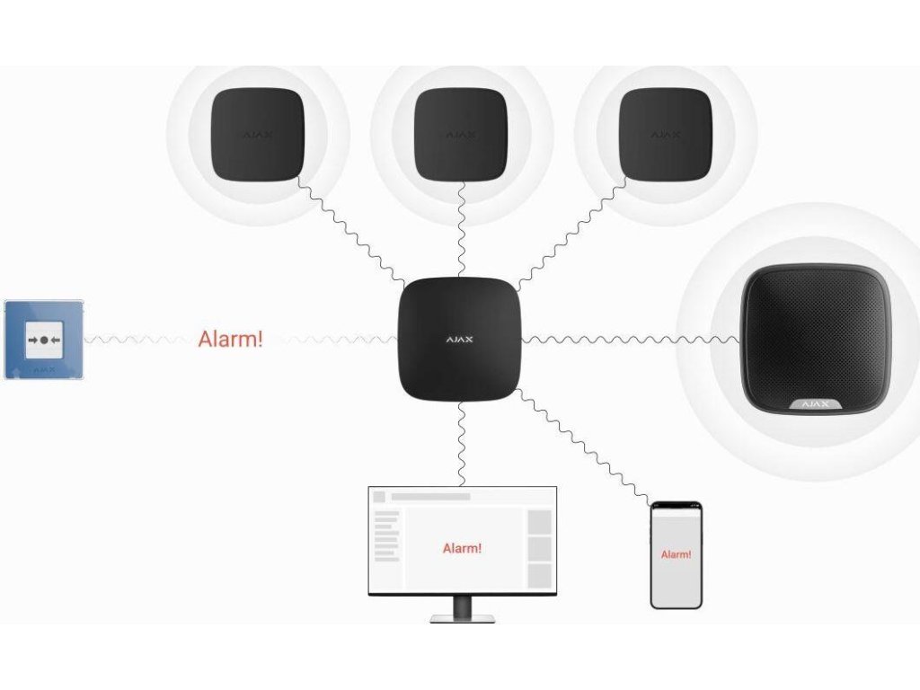 ManualCallPointje bezdrátové tlačítko určené k vyvolání požárního poplachu. Po stisktnutí se spustí všechny požární detektory v systému a dojde k automatickému informování uživatele a CMS. Všechna relevantní data jsou okamžitě k dispozici v aplikaci Ajax, včetně informací o spuštění, času a místě. V případě život ohrožující situace aktivuje zařízení inovativní funkce jako je odpojení zařízení, aktivace nouzového osvětlení a odemčení východů.
