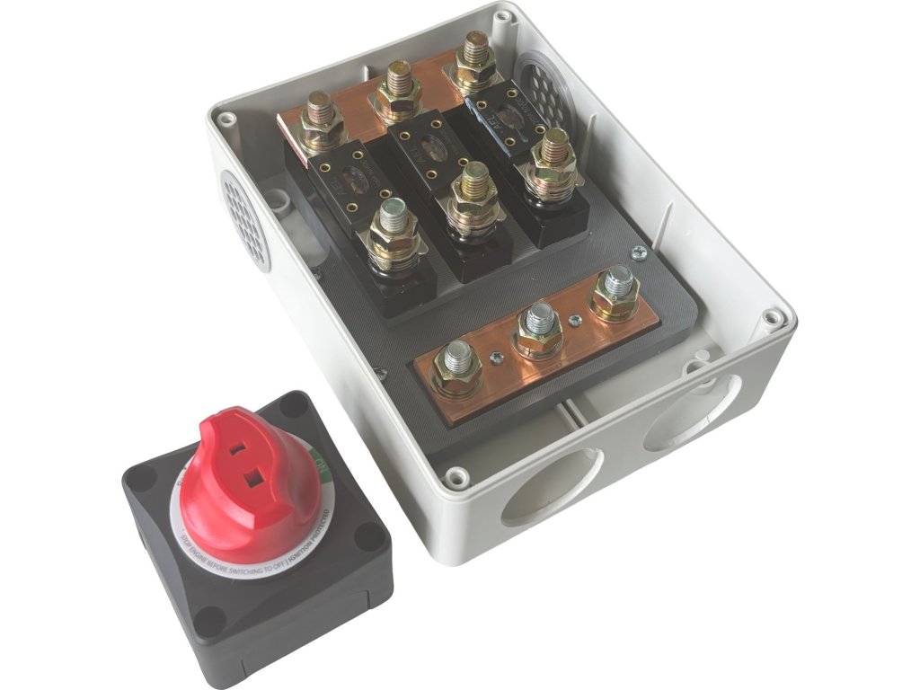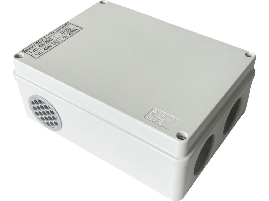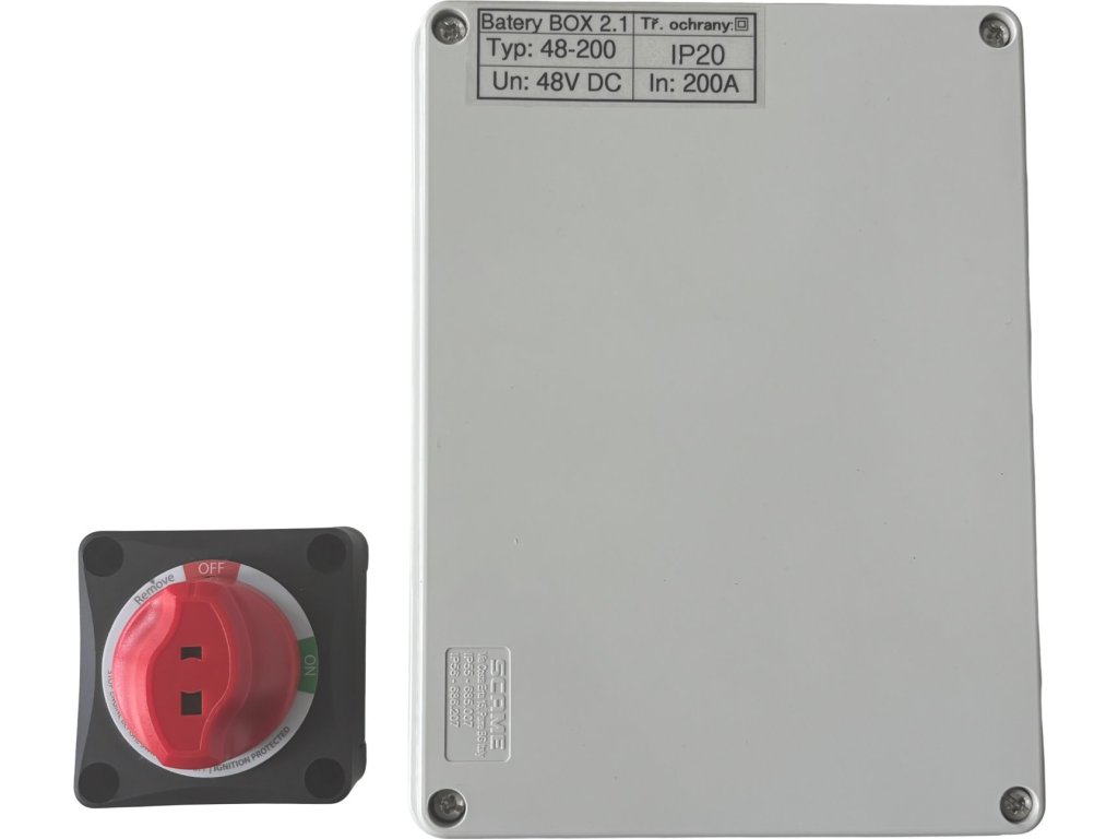 Bateriový box slouží pro paralelní propojení 2 baterií a 1 měniče v napěťové hladině 48 V DC. Box je vybaven pojistkami 100 A pro jednotlivé baterie a 250 A pro výstup k měniči. Box je dobře připraven na instalaci přívodních i odchozích kabelů díky trojici otvorů na spodní straně krabice. K boxu je dodáván s odpojovačem pro DIY instalaci.