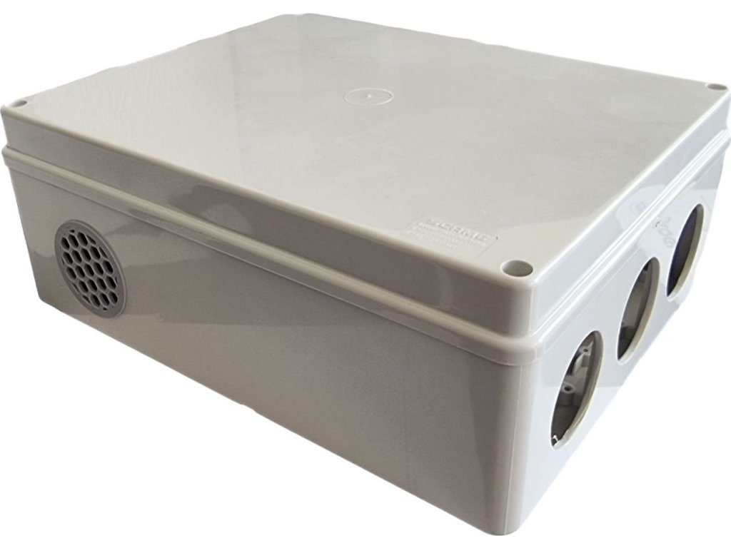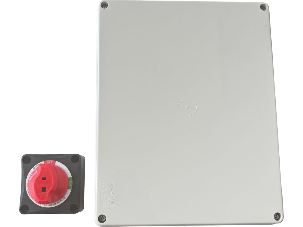 Bateriový box slouží pro paralelní propojení 4 baterií a 1 měniče v napěťové hladině 48 V DC. Box je vybaven pojistkami 100 A pro jednotlivé baterie a 250 A pro výstup k měniči. Box je dobře připraven na instalaci přívodních i odchozích kabelů díky trojici otvorů na spodní straně krabice. K boxu je dodáván s odpojovačem pro DIY instalaci.