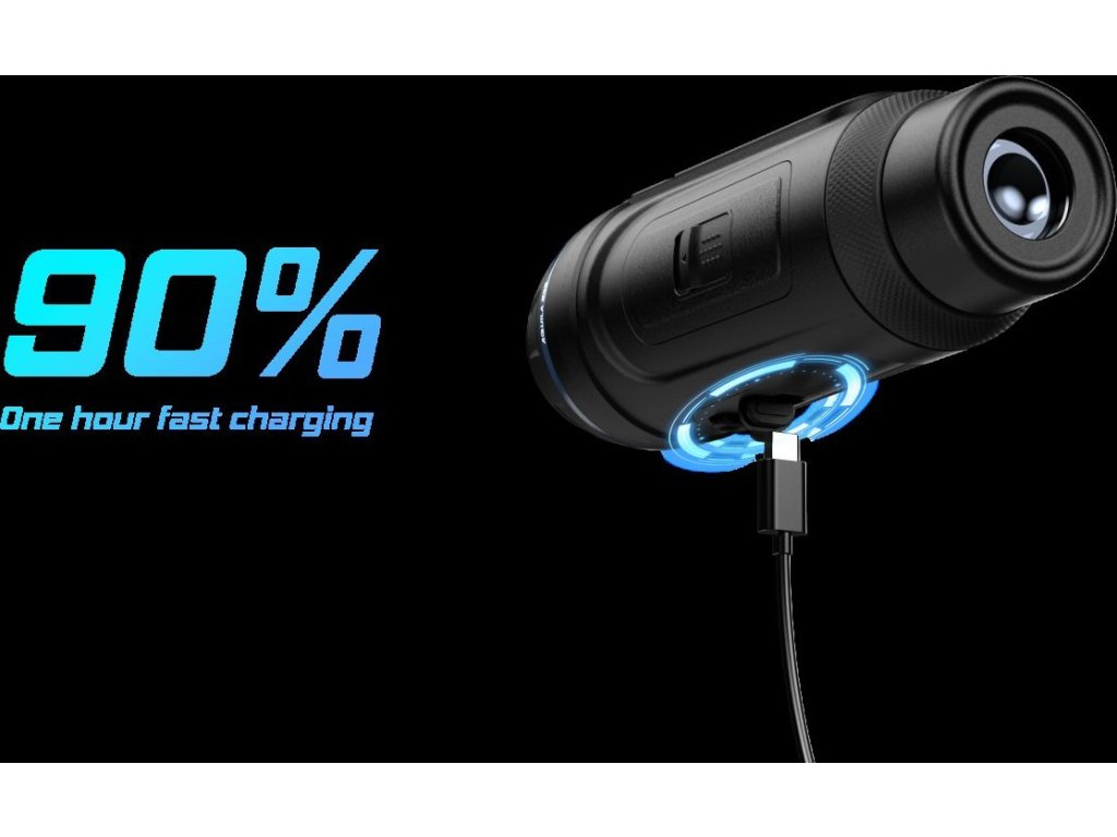 Aquila je vybavena dvojím zdrojem energie – vestavěnou a vyměnitelnou baterií, která zajišťuje až 10 hodin nepřetržitého provozu. Externí baterii lze vyměnit i během používání, takže zařízení zůstává stále aktivní bez nutnosti vypínání. Díky funkci rychlého nabíjení se navíc dokáže nabít na 90 % kapacity za pouhou 1 hodinu. Nabíjecí modul funguje také jako samostatná nabíječka, což zajišťuje snadné a pohodlné dobíjení v terénu i doma.