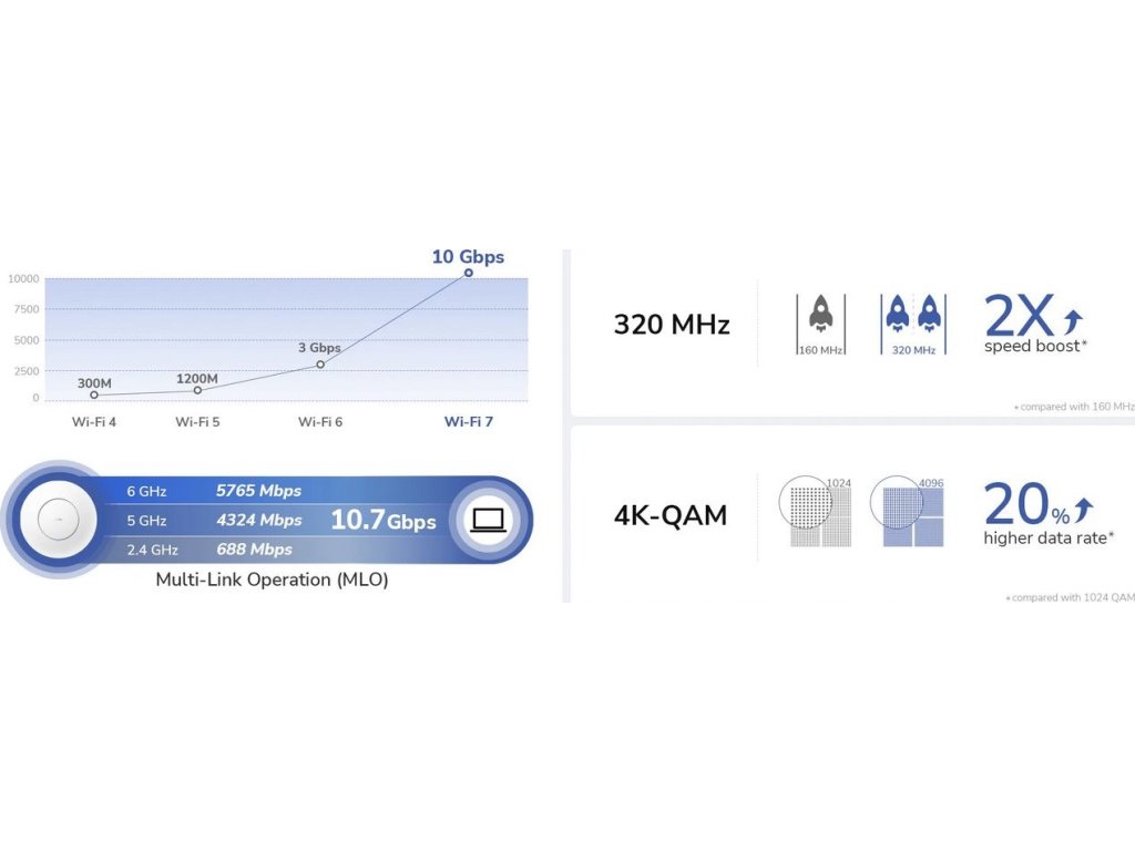 - Dual-Band Wi-Fi 7 (802.11be) - 688 Mbps (2.4 GHz) + 4320 Mbps (5 GHz) + 5760 (6 GHz)