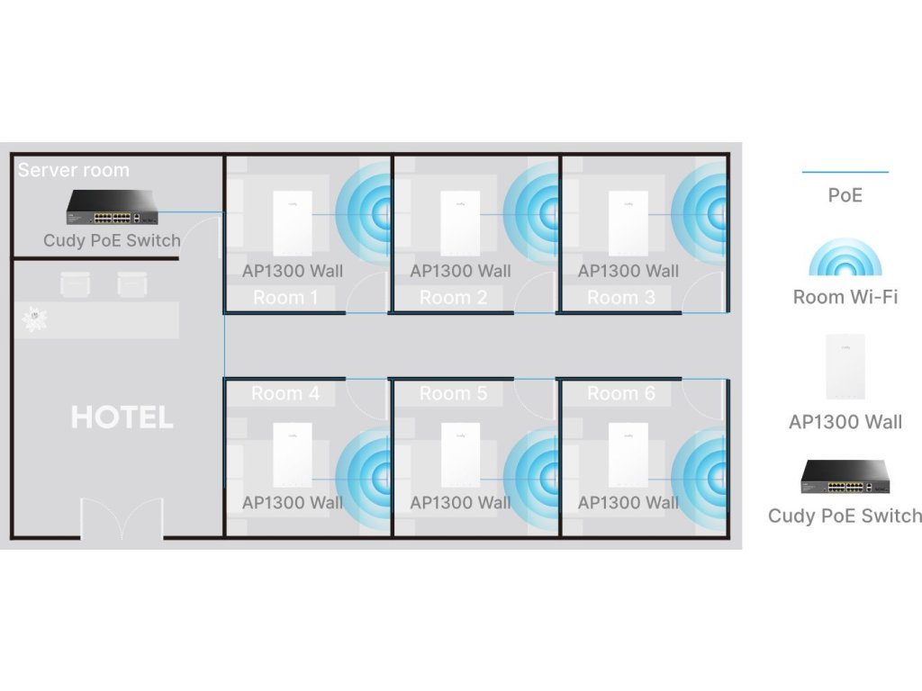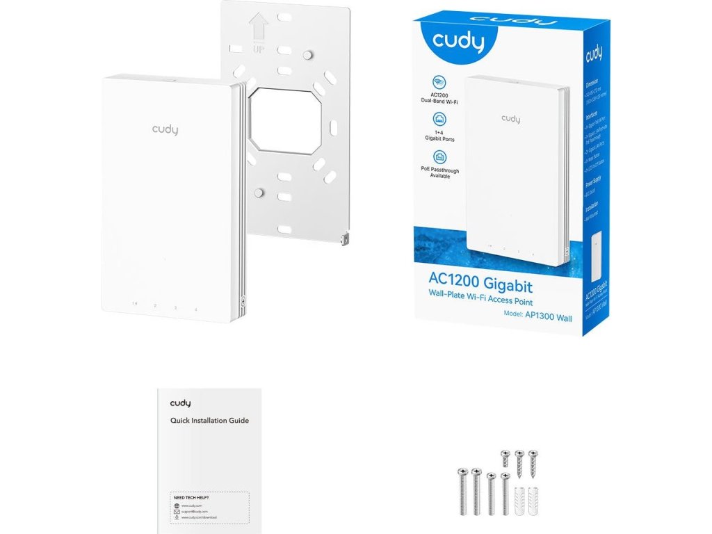 Dual-Band Access Point AP1300 Wall od společnosti Cudy je Gigabitový Access Point pro vnitřní použití, s umístěním na krabičku ve zdi a slouží k pokrytí větších prostor jako jsou hotely, nemocnice, kanceláře a podobně. S dalšími jednotkami je možné využít rychlý *Mesh Roaming. Jednotka zvládne obsluhovat až 100+ klientů.