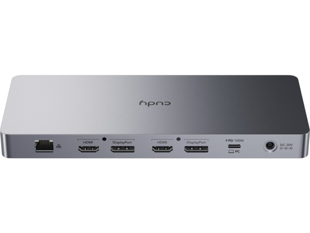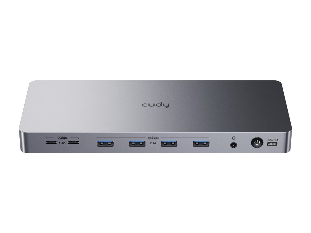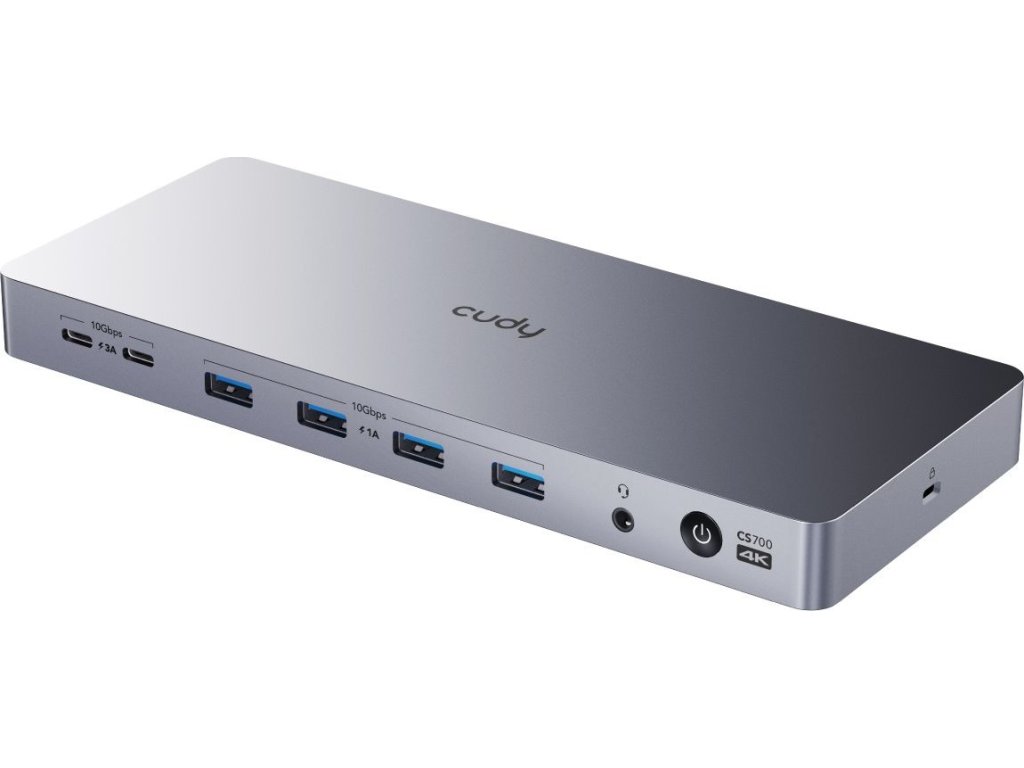 Cudy CS700 je moderní dokovací stanice 13 v 1 - nabízí napájecí výkon až 100 W pro váš notebook pomocí USB-C 3.2, duální výstup 4K nebo jeden 5K s HDMI 2.0 a Display Port 1.2a. Rychlé nabíjení 100 W s čtyřmi profily nabíjení usnadňuje správu kabelů. Šest USB portů (2x USB-C, 4x USB-A), Gigabit Ethernet a kombinovaný audio port maximalizují efektivitu připojené dokovací stanice. Kompatibilní na vstupu je s USB-C 3.2 Gen 2 / USB4 nebo Thunderbolt 3/4. Maximální celková spotřeba 150 W díky externímu adaptérem 20 V / 7,5 A.
