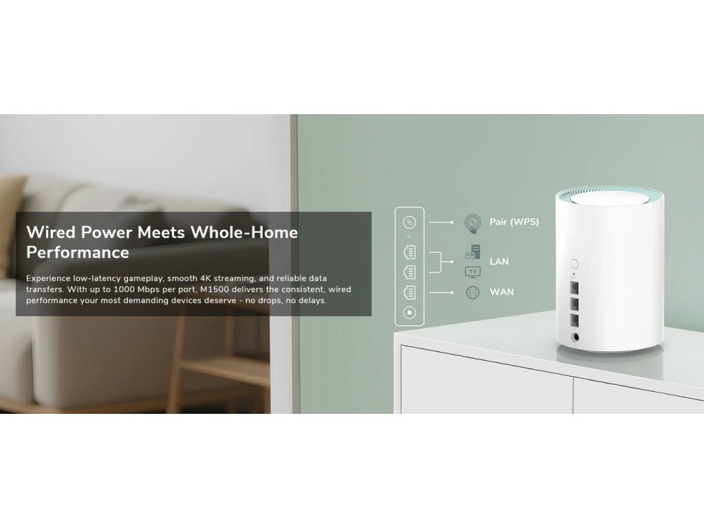 Mesh systém není nic jiného než sada routerů pro použití v domácnostech, bytech, kancelářích, kde je pokrytí Wi-Fi sítí z jednoho routeru příliš slabé. Více Mesh jednotek si mezi sebou automaticky předává klienty a komunikuje mezi sebou pouze bezdrátově. Balení obsahuje tři zařízení, které jsou již nakonfigurováno a nevyžadují zásah uživatele kromě nastavení názvu Wi-Fi. Ideální řešení pro pokročilé i laiky v oblasti správy sítí a budování velké bezdrátové sítě.