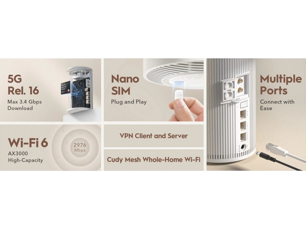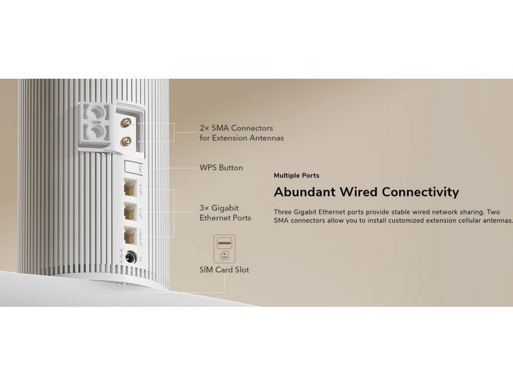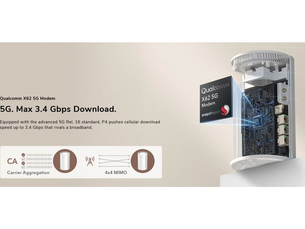 Bezdrátový LTE/5G router s mobilní rychlostí až 3400/550 Mbps (NSA) / 2400/900 Mbps (SA) a podporou Wi-Fi 6 nabízí připojení přes mobilní 5G/LTE nebo kabel. S Dual Band Wi-Fi 574 + 2402 Mbps a 6 vestavěnými anténami zajišťuje stabilní signál. Tři Gigabit LAN porty umožňují flexibilní použití (jeden lze přepnout na WAN). Navíc podporuje VPN server/klient.
