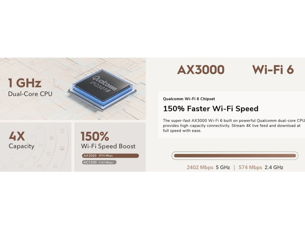 - Dual Band Wi-Fi 6 - 2402 / 574 Mbps