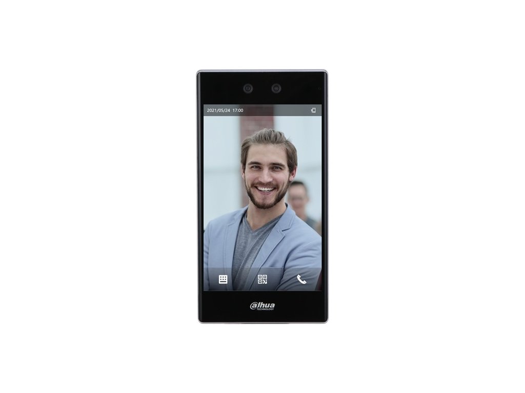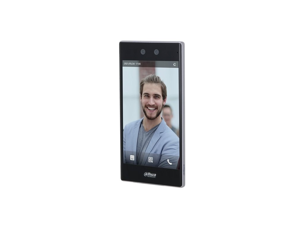 IP přístupová jednotka s biometrickým snímačem obličeje, detekcí tělesné teploty a roušky, RFID MIFARE 13,56 MHz, kapacita 100 000 obličejů, 500 000 karet, 100 000 událostí, komunikace s PC přes TCP/IP, podpora DSS Professional, Softplus, zvuková a LED signalizace, 1× vstup dveřního kontaktu, 2× relé výstup alarmu, 1× relé vstup odchodového tlačítka, Wiegand 26 vstup/výstup pro připojení podružné čtečky, napájení 12 V DC (zdroj je součástí balení), rozměry 237,4 × 122,6 × 24,8 mm. V rámci Softplus integrované: