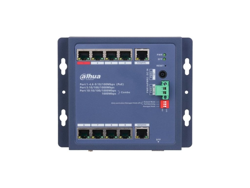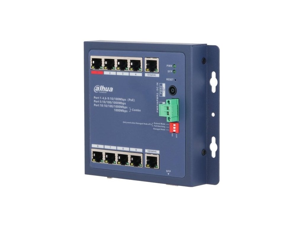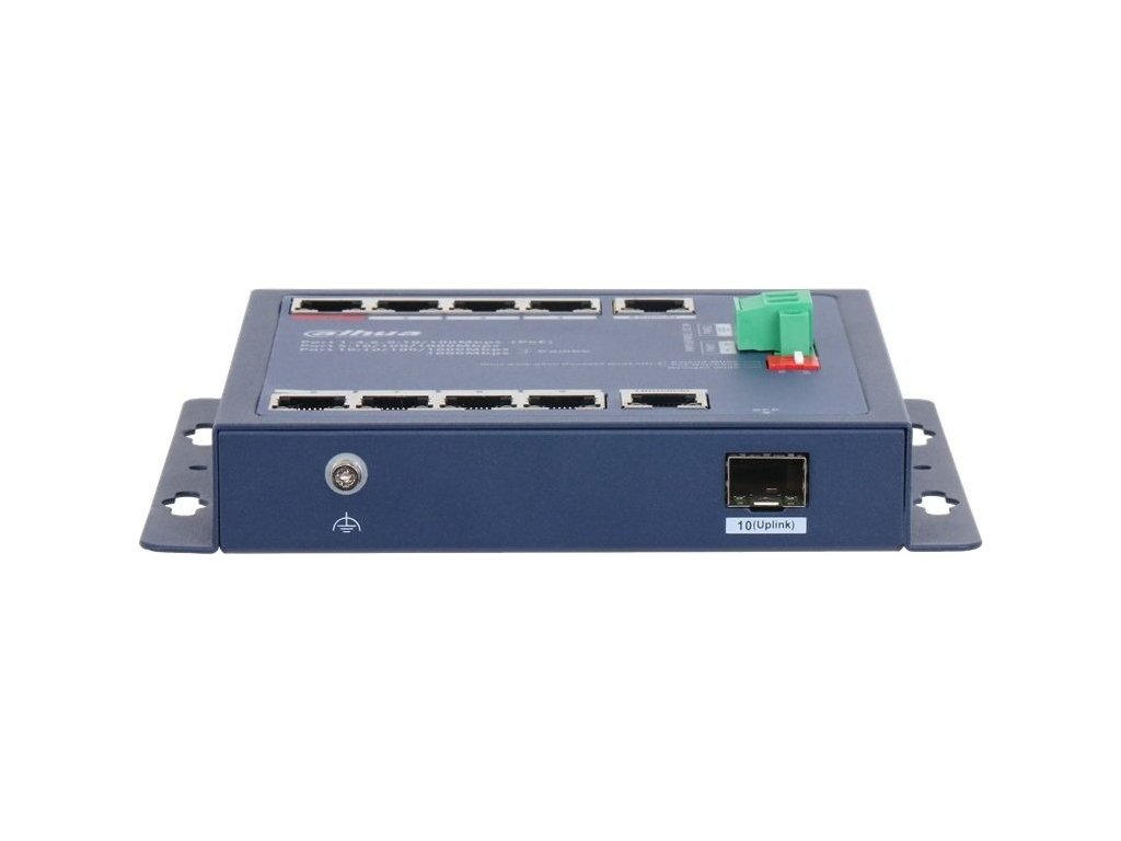 Průmyslový 10portový PoE switch, 7× RJ-45 10/100 Mbit PoE+ 30 W (802.3af/at), 1× RJ-45 10/100 Mbit PoE++ 90 W (802.3af/at/bt, Hi-PoE), 1× 10/100/1000 Mbit RJ-45, 1× SFP 1000 Mbit / 10/100/1000 RJ-45 Combo port; PoE max. 90 W; Long Distance PoE 250 m, PoE Watchdog; spravovatelný L2, cloud; Switching Capacity: 5,6 Gbps, Packet Forwarding Rate: 4,17 Mpps, Packet Buffer Size 4 Mbit, MAC Table Size 8K; napájení 2× 48-57 VDC 2-1,69 A, terminálový blok + DC; provozní teplota -40 °C – +85 °C, rozměry: 154,3 × 110,4 × 30 mm, možnost montáže na DIN lištu nebo stůl; IP30 a IK06.