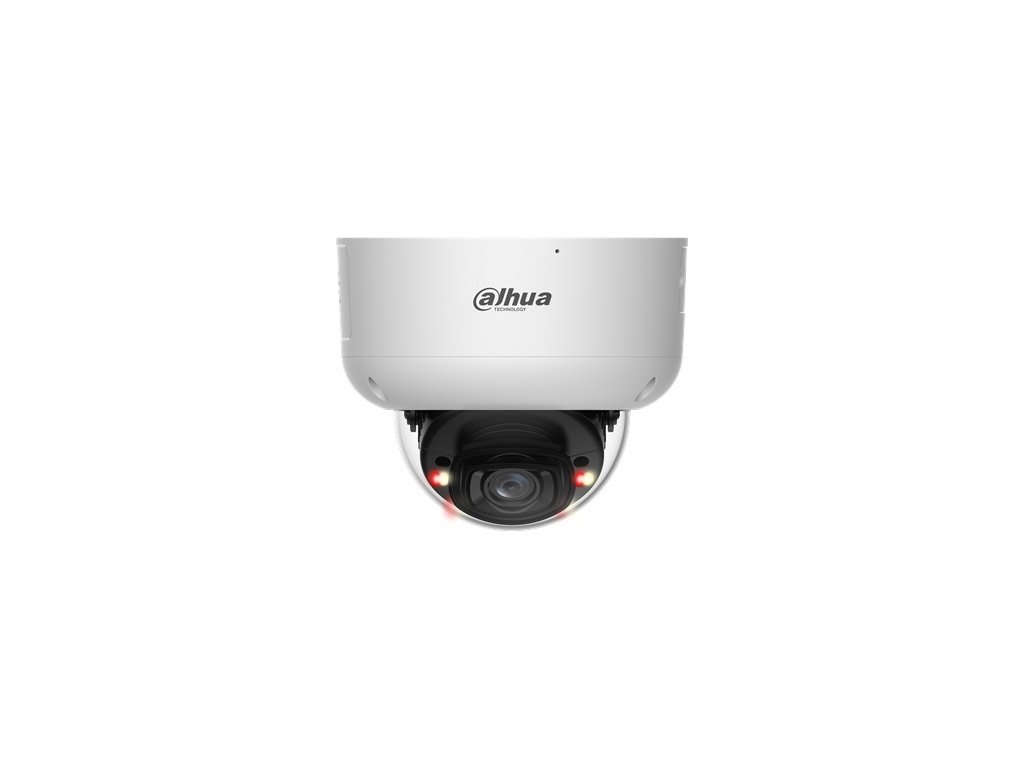 4Mpx dome IP kamera, venkovní provedení, Day/Night, IR 60 m, WL 50 m, 1/1.8" 4megapixelový CMOS snímač, rozlišení 2688 × 1520 px při 1–25/30 fps, citlivost 0,0004 lx @ F1.0, objektiv 2,8 mm, úhel záběru H: 111°, V: 60°, D: 135°. Funkce AWB, AI-ISP, BLC, HLC, WDR 140 dB, AGC, ROI, 3DNR, SSA, Defog, LDC, WizColor. Komprese H.265 / H.264 / H.264H / H.264B / MJPEG (Sub Stream), RTMP, podpora Smart a AI kodeků, kompatibilní s ONVIF. Inteligentní funkce: IVS (ochrana perimetru), Large AI model (Xinghan), SMD 4.0, AcuPick, detekce obličejů, počítání osob, řízení front, Heat Map, video metadata, Smart Search. Aktivní odstrašení. Rozhraní RJ-45, vestavěný mikrofon a reproduktor, slot pro microSD kartu až 1 TB, alarm I/O 1/1, audio I/O 1/1, 1× RS-485, 1× 12 VDC výstup. Napájení 12 VDC / PoE+ (802.3at) / ePoE, Dual Power Backup, maximální spotřeba 17,5 W. Provozní teplota −40 °C až +60 °C, krytí IP67, IK10, rozměry 105,5 mm × ø 126,0 mm, hmotnost 0,73 kg, bílá verze.