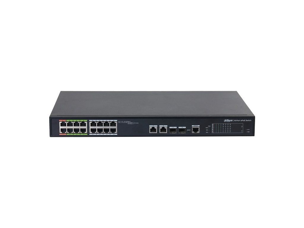 Dahua switch s podporou ePoE, Porty 1–16: 10/100 Mbps, Porty 17–18: 10/100/1000 Mbps, Porty 19–20: SFP 1000 Mbps (combo), podpora ePoE pro porty 1–8, porty 1 a 2 max. 60 W, porty 3–16 max. 30 W, manažovatelný, standardy IEEE802.3af, IEEE802.3at, Hi-PoE, celkem na všechny porty max. 240 W, PoE Watchdog, ochrana proti přepětí až 4 kV, možnost osazení do racku, pracovní teplota od -10 °C do +55 °C, rozměry 440 × 300 × 44 mm