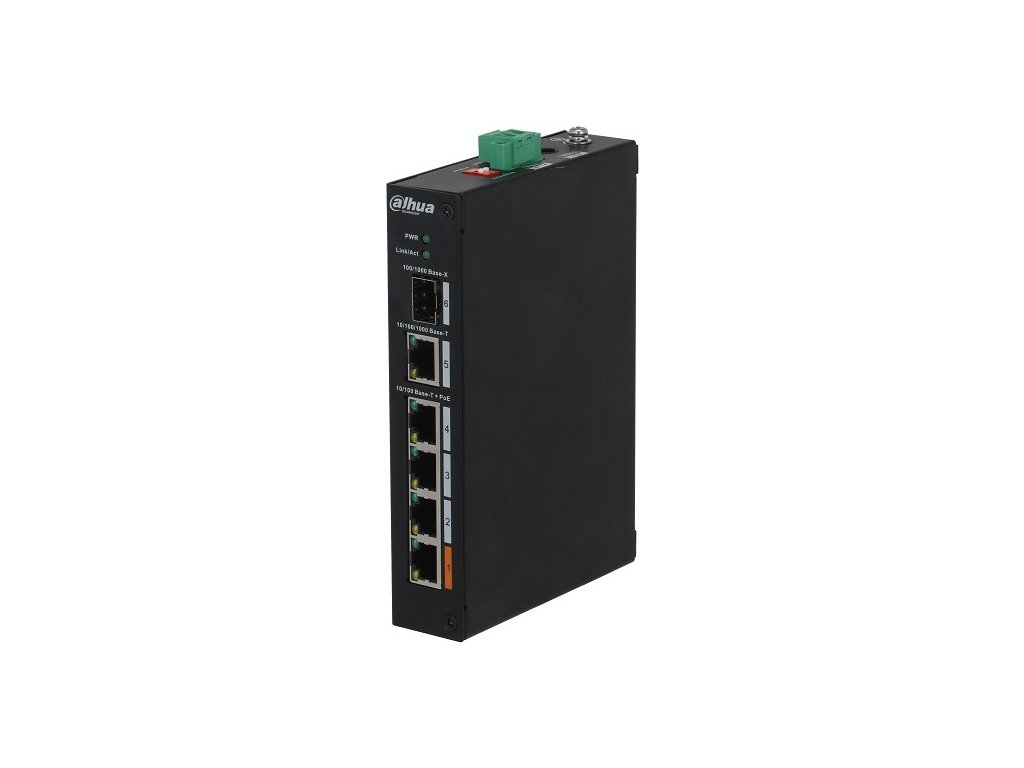 Dahua switch 4x 10/100 Mbps + 1x 10/100/1000 Mbps + 1x SFP 100/1000 Mbps, port 1 podpora Hi-PoE max. 60 W, porty 2-4 PoE (IEEE802.3af, IEEE802.3at) <30 W, celkem na všechny porty max. 60 W, PoE watchdog, Long Distance PoE, ochrana před přepětím 4 KV, napájení 53 V DC (zdroj je součástí balení), pracovní teplota od -30 °C do +65 °C, hmotnost 0,45 kg, rozměry 150 x 100 x 30 mm