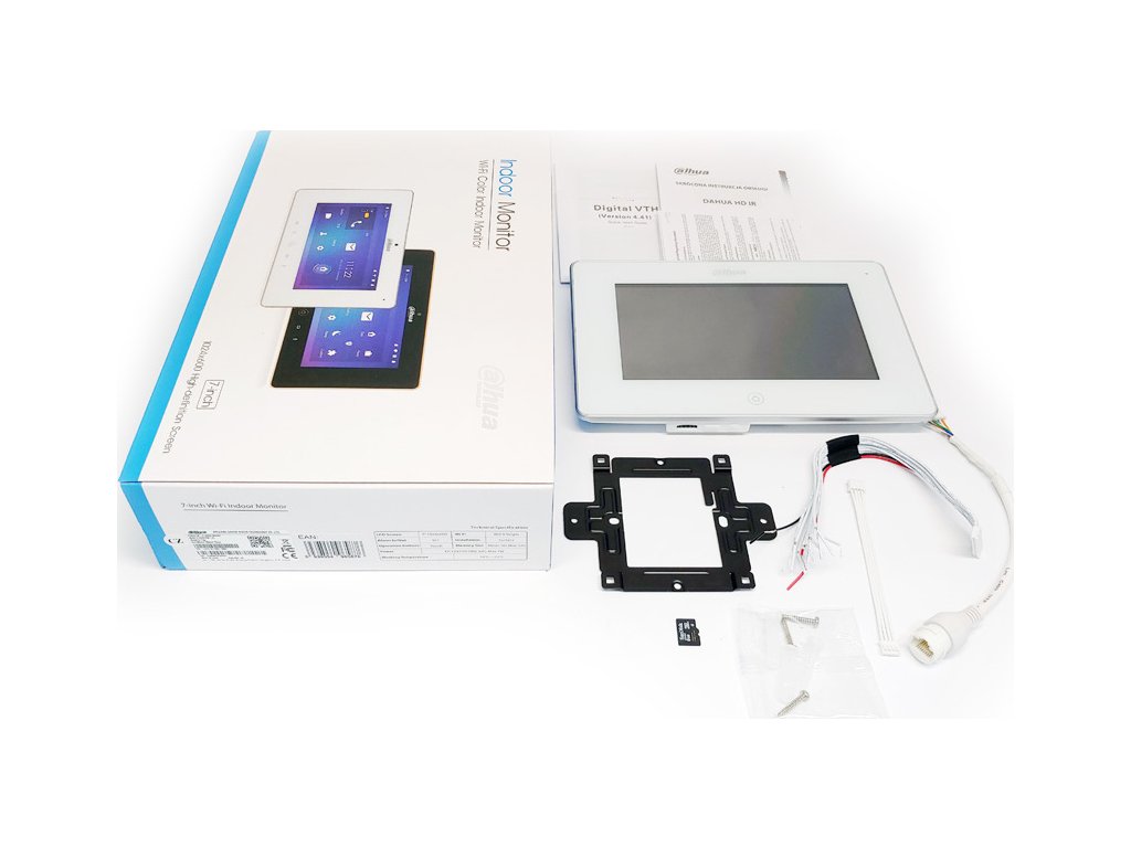 IP Dahua handsfree videomonitor, provedení bílý plast, 7" barevný dotykový LCD displej s rozlišením 1024 x 600 px, komprese H.264, komunikace TCP/IP, Wi-fi IEEE802.11b/g/n, grafické menu, dotyková tlačítka, možnost automatického vytvoření obrázků při nepřijatém hovoru nebo videa při zanechání odkazu po vložení micro SD karty (karta není součástí balení), interkom v rámci více monitorů v bytě (max. 6 monitorů), připojitelnost až 20 dveřních jednotek, možnost připojení externích CCTV Dahua IP kamer, podpora přenosu videohovoru / Push oznámení na Android a iOS chytré telefony přes internet (aplikace DMSS), 1x RJ-45 konektor pro připojení do sítě, 6x NO kontakt pro připojení alarmových vstupů - funkce EZS ústředny, 1x NO alarmový výstup, ovládání 2 zámků (při kombinaci s podporovanou dveřní jednotkou a modulem druhého zámku DEE1010B), přizvonění od dveří, napájení externím zdrojem 12 V DC / 2000 mA (zdroj není součástí balení) nebo PoE switchem (802.3af), montáž na povrch, rozměry 215 x 140 x 21 mm, interiérové použití