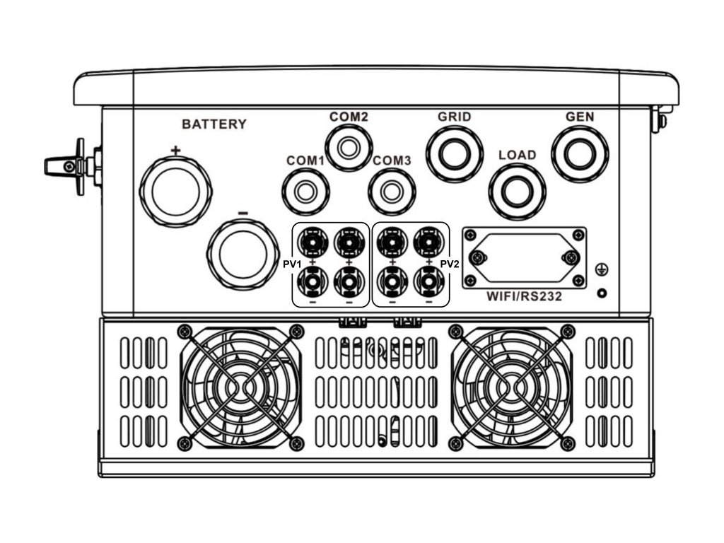 - Rozhraní ke komunikaci: CAN/RS-485 (pro BMS), Modbus (RTU 485 například pro Loxone, nebo externí řídící systém), RS-232 (pro cloud dongle)