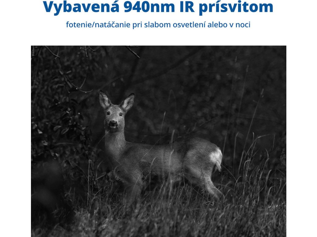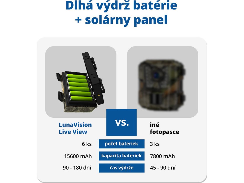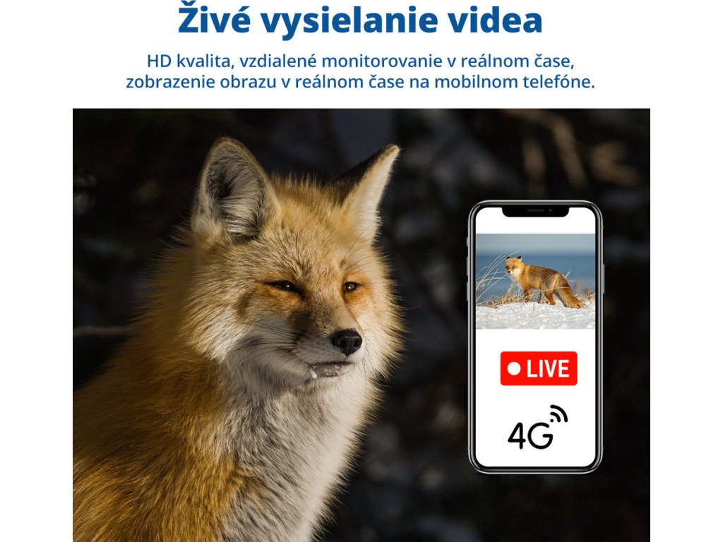 Vaše nová oblíbená fotopast! Live sledování HD videa + možnost cloud úložiště. Solární panel, baterie, 64 GB paměťová karta a SIM karta v ceně! Klíčové vlastnosti fotopasti LunaVision Live View 4G (v2) SIM karta Eiotclub v balení (pro 30 zemí Evropy s 300mb zdarma na 30 dní) / možnost využívat vlastní SIM kartu Kapacita baterek (6ks v balení) až 15600 mAh! Výdrž 90 - 180 dní + automatické přepnutí napájení přes solární panely (v balení) IR přísvit o vlnové délce 940 nm (neviditelný pro zvěř) Rychlá spoušť 0.5 sec. Vodotěsnost s certifikací IP66 Live sledování HD videa (2.7K - 2560 x 1440/14 MP) přes 4G LTE Možnost využívat cloud úložiště + 64 GB paměťová karta v balení (max. 128 GB) Ovládání přes mobilní aplikaci (Android nebo iOS): Zobrazení a vymazání obrázků/videí, Správa nastavení fotopasti, Sledování baterie a mobilního signálu, Sdílení do libovolného telefonu... Mikrofon a reproduktor pro obousměrné audio Sdílení fotopasti přes aplikaci pro další osoby možnost nastavit různé pravomoci: ovládání a nastavování fotopasti, jen prohlížení video/foto atp. Technické parametry: Typ čidla: CMOS, Max. 14,0 MP Paměťové médium: SD karta 64 GB v balení (max. 128 GB) / cloudové úložiště Čočka: F=1,6 f=6,0 Rychlost spouště: 0,5 s IR LED: 4 vysoce výkonné LED s ICR, 940 nm Citlivost PIR: nastavitelná (vysoká, střední, nízká) Detekční vzdálenost PIR: 0 – 20 m Detekční úhel: PIR 50° Zpoždění PIR: 10 s – 5 min (volitelné) Provozní režim: Foto/video Rozlišení fotografií: Formát: JPEG rozlišení 14,0 MP (5120 x 2880) Rozlišení videí: Formát: MP4, komprese H265, rozlišení: 2.7 K (2560 x 1440). Videa uložená v cloudu: 640 x 360. Délka videí: 5 s – 60 s Mikrofon: Ano, zabudovaný Reproduktor: Ano, zabudovaný Ovládání na dálku: Vzdálený přístup přes mobilní telefon, obousměrné ovládání Mobilní aplikace: Ano Živý přenos: Ano Cloudové úložiště: Ano Pracovní napětí: 5V DC Baterie: 6 ks baterií typu 18650 (v balení) Nabíječka: 5V DC/1A SIM karta: Nano SIM karta Jazyk systému: Automaticky nastavitelný podle jazyka mobilního telefonu Výdrž baterie ve stand-by režimu: 180 dní (6 ks baterií typu 18650) Provozní teplota: od -20 °C do 70 °C Vodotěsnost: IP66 Rozměry: 93 (D) • 55 (Š) • 141 (V) mm (bez antény). Anténa: 180 mm. Hmotnost: Přibližně 327 + 5 g (bez baterií) Obsah balení: 1x Fotopast LunaVision Live View (v2) 1x Anténa 1x Solární panel 1x Držák solárního panelu 6x baterie 18650 1x Datový kabel 2x popruh 1x Držák 3x balení šroubů 1x 64 GB paměťová karta 1x SIM karta 1x návod a záruční list Doporučujeme přikoupit: Kovový držák