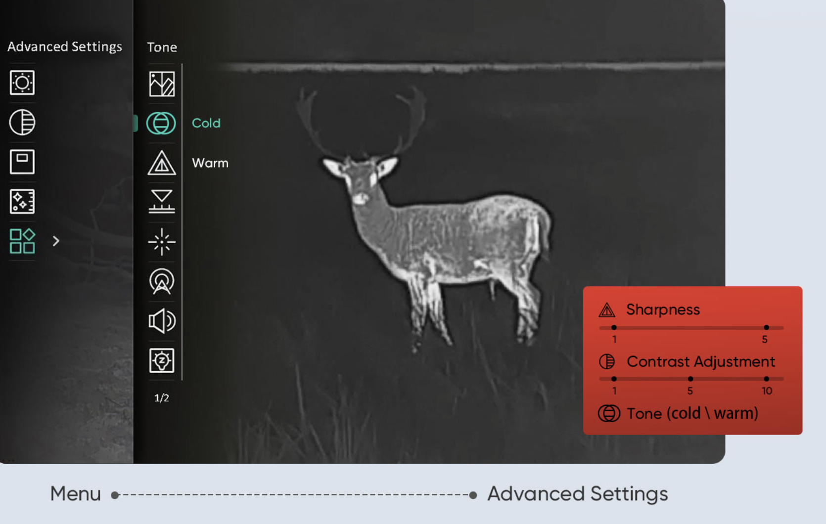 Termovizní monokulár HIKMICRO CONDOR se vyznačuje hierarchickým menu, které upřednostňuje často používané funkce podle zvyklostí uživatele. Uživatelé si mohou přizpůsobit vizuální zážitek na nejvyšší úroveň pohodlí úpravou nastavení, jako je kontrast, ostrost a další personalizované možnosti.