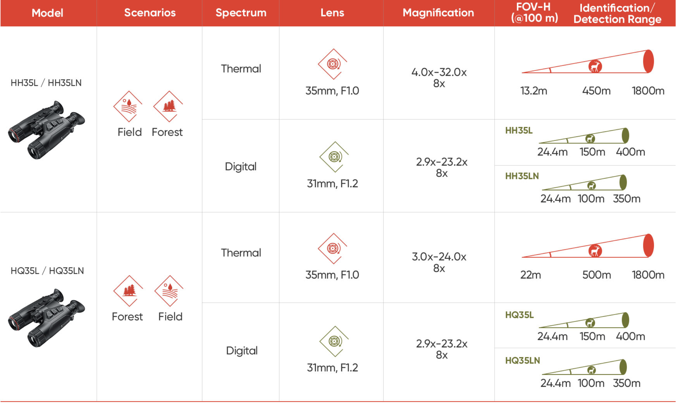 Senzor Termovizní modul Digitální modul Rozlišení 384 × 288 px 2560 × 1440 px Teplotní citlivost ≦ 20 mK - Přísvit - 940nm Čočka 35 mm 31 mm Detekce 1800 m 350 m Optické zvětšení 5x 2,9x Zorné pole 7,5° × 5,7° 13,9° × 7,8° Rozlišení displeje 1920 × 1080 px Wi-Fi Ano Laserový dálkoměr Ano, 1000 m Digitální zoom 8x Dioptrická korekce -5D~+3D Možnost pořízení fotografie Ano Možnost pořízení videa Ano Možnost zvukového záznamu Ano Stupeň ochrany IP67 Paměť vestavěná, 64 GB Provozní teplota -30°C až 55°C Baterie 2x Li-ion 18650 Výdrž baterie 6 hod Hmotnost 780 g Rozměry 138 × 68 × 212 mm Obsah balení: