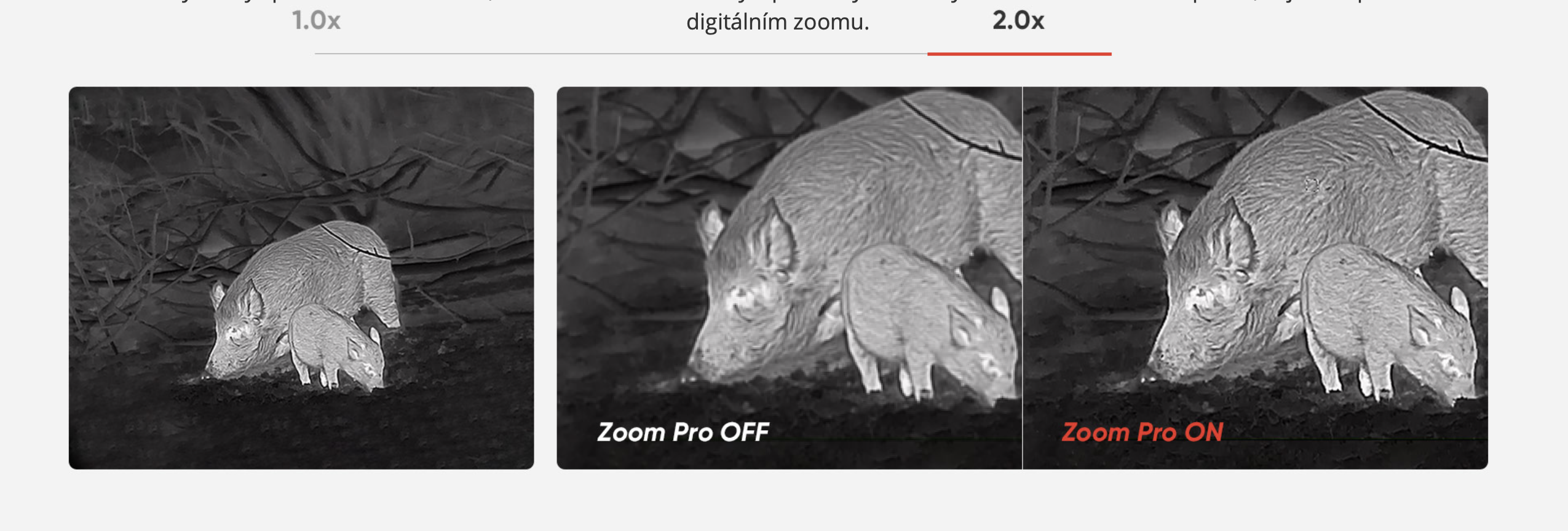 Vlastní vývoj obrazového algoritmu přináší ohromující kvalitu obrazuNa základě rozsáhlé analýzy termovizních loveckých snímků poskytuje HABROK obrazový algoritmus Zoom Pro, vyvinutý společností HIKMICRO, mimořádně čisté snímky s působivými detaily a menším množstvím pixelů, zejména při digitálním zoomu.