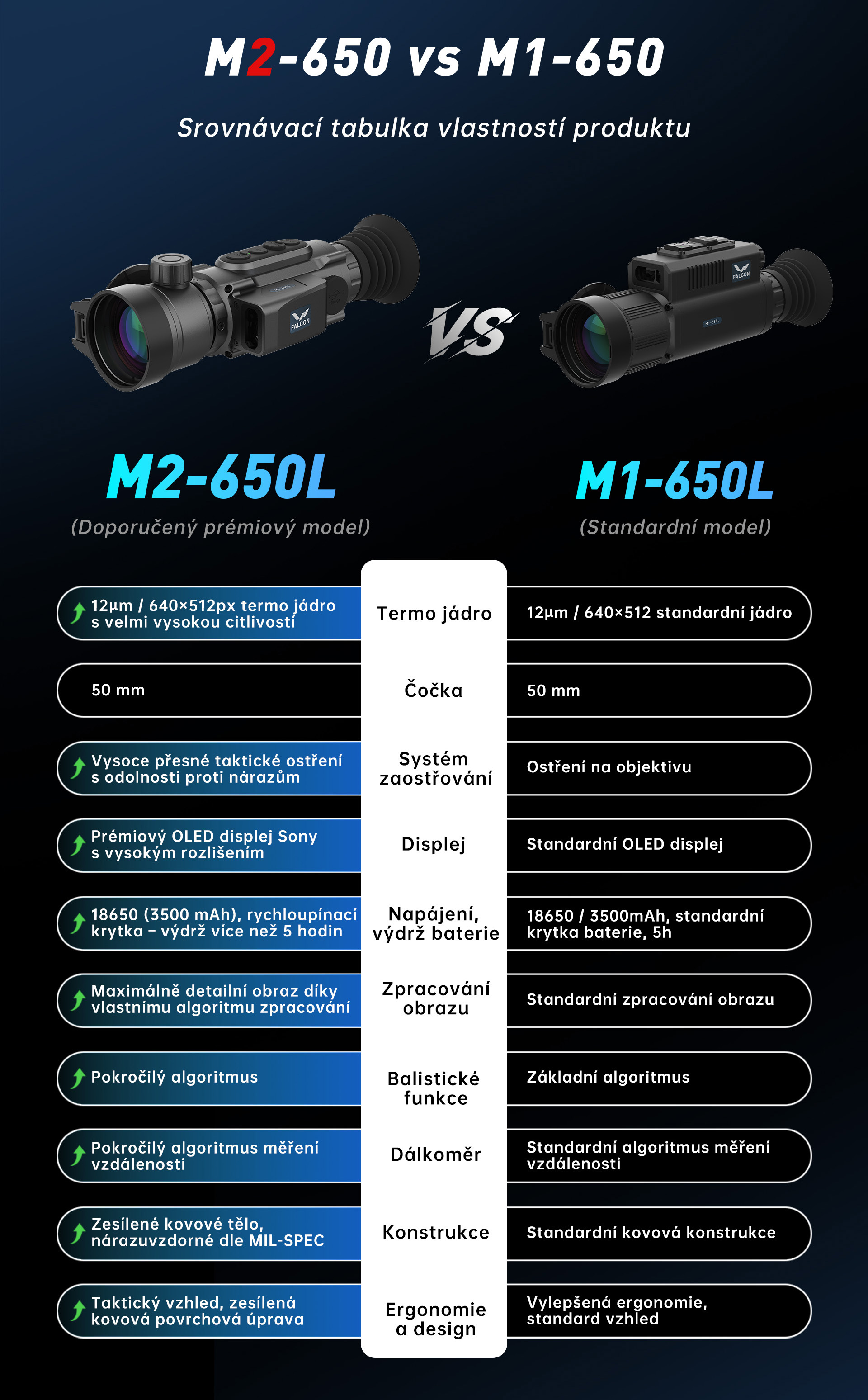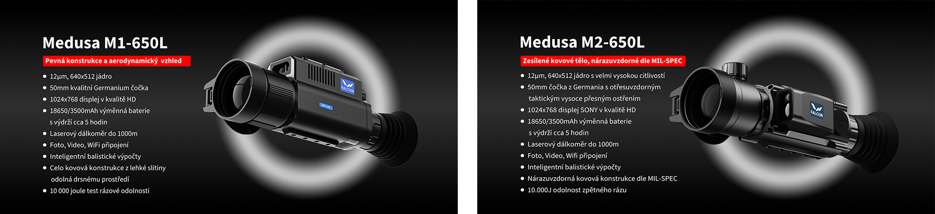 Srovnání termovizních zaměřovačů FALCON MEDUSA M1-650L a M2-650L (technické a produktové):