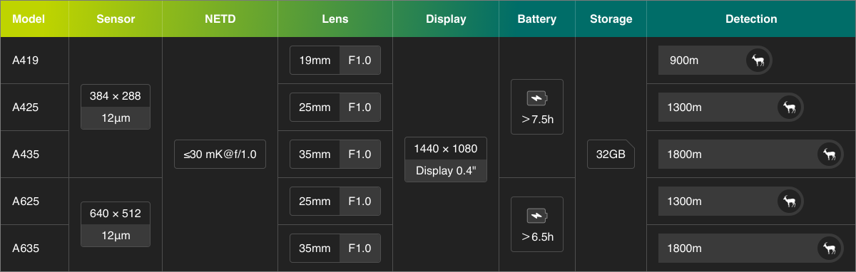 Navzdory kompaktnímu tělu má stále vysoký pozorovací výkon. Je vybaven 12μm detektorem a dvěma detektory s rozlišením 384×288 a 640×512. Používá objektiv F1,0 25/35 mm, a přesto má perfektní detaily obrazu i při pohledu do dálky.
