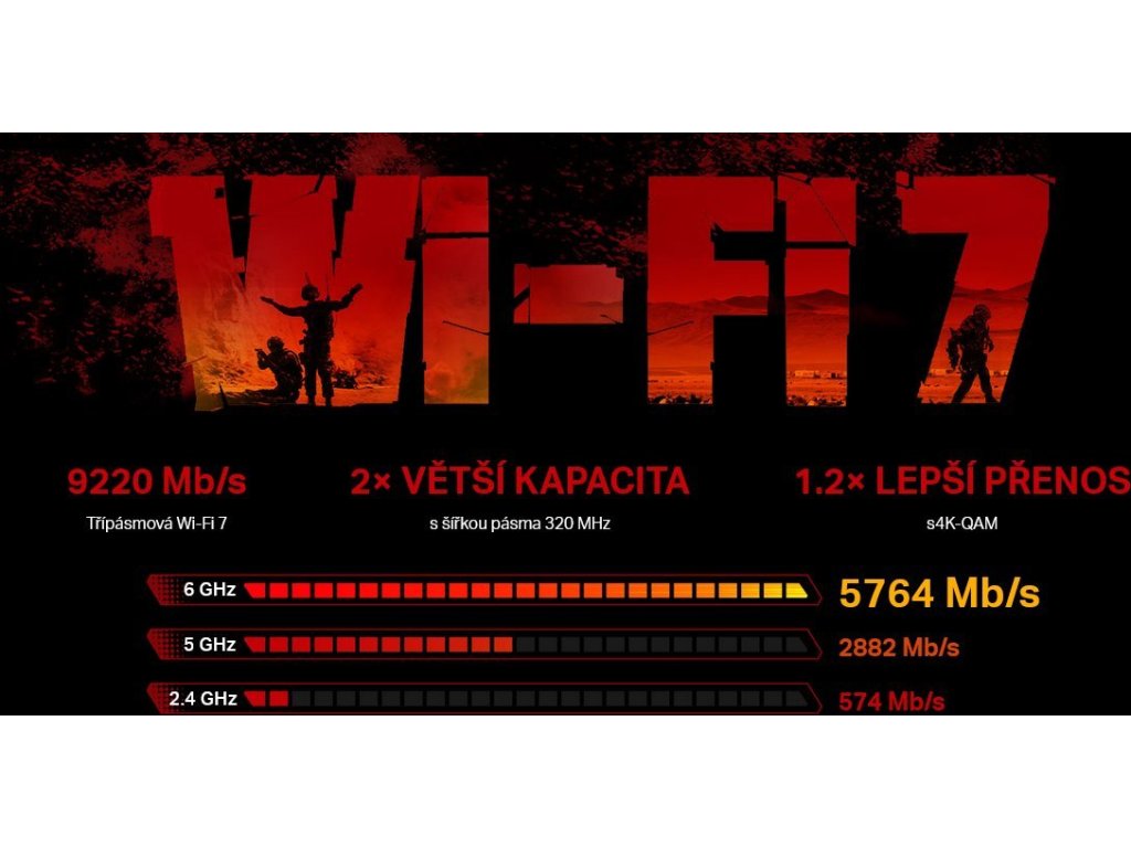 - Třípásmová Wi-Fi 7 s rychlostí až 5764 Mb/s v pásmu 6 GHz, 2882 Mb/s v 5 GHz a 574 Mb/s v 2,4 GHz