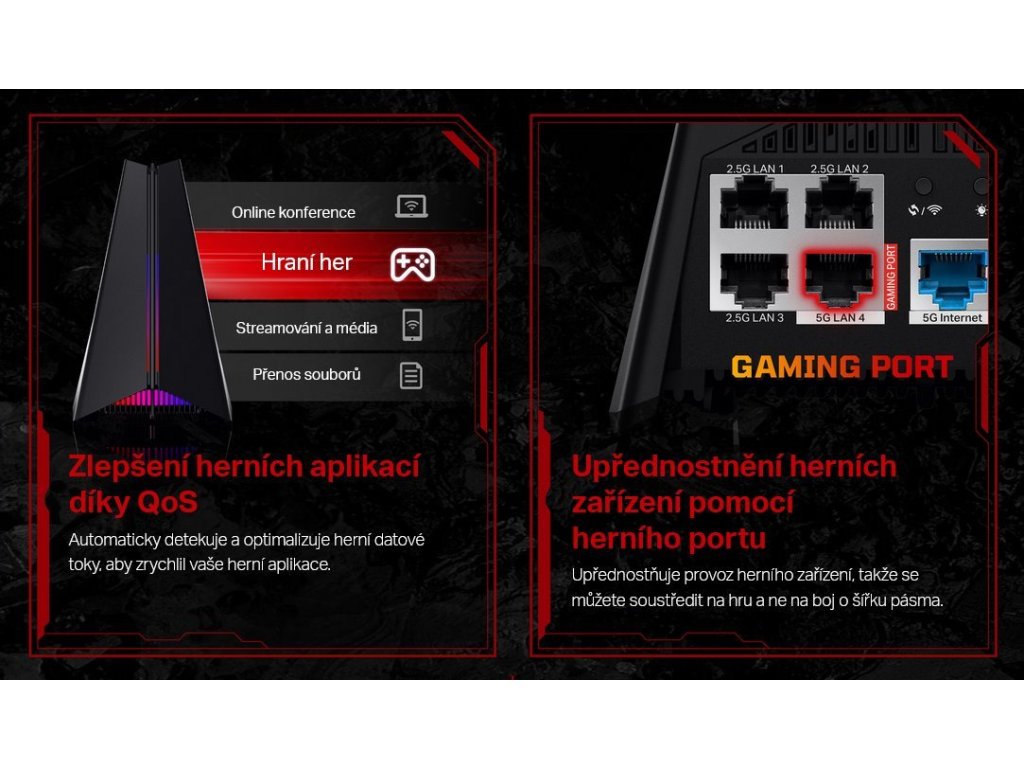 - Herní akcelerace a vyhrazené 5GHz herní pásmo