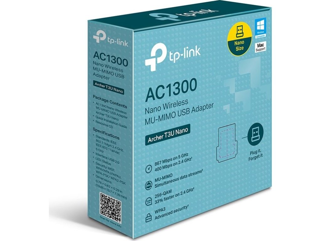 Archer T3U Nano poskytuje vašemu počítači přístup k technologii 802.11ac včetně starších 802.11a/b/g/n, podporuje MU-MIMO technologii pro vyšší efektivitu využití pásma a také podporu dvou bezdrátových pásem - až 400 Mbps v pásmu 2,4 GHz a 866 Mbps v pásmu 5 GHz. Vyberte si pásmo 2,4 GHz vhodné pro surfování, odesílání e-mailů a sociální média, nebo přepněte na pásmo 5 GHz pro hraní her, streamování a stahování velkých souborů. Výhodou USB adaptéru je jeho malá velikost - nenápadný design vám umožní jej zapojit a zapomenout, že tam vůbec je.