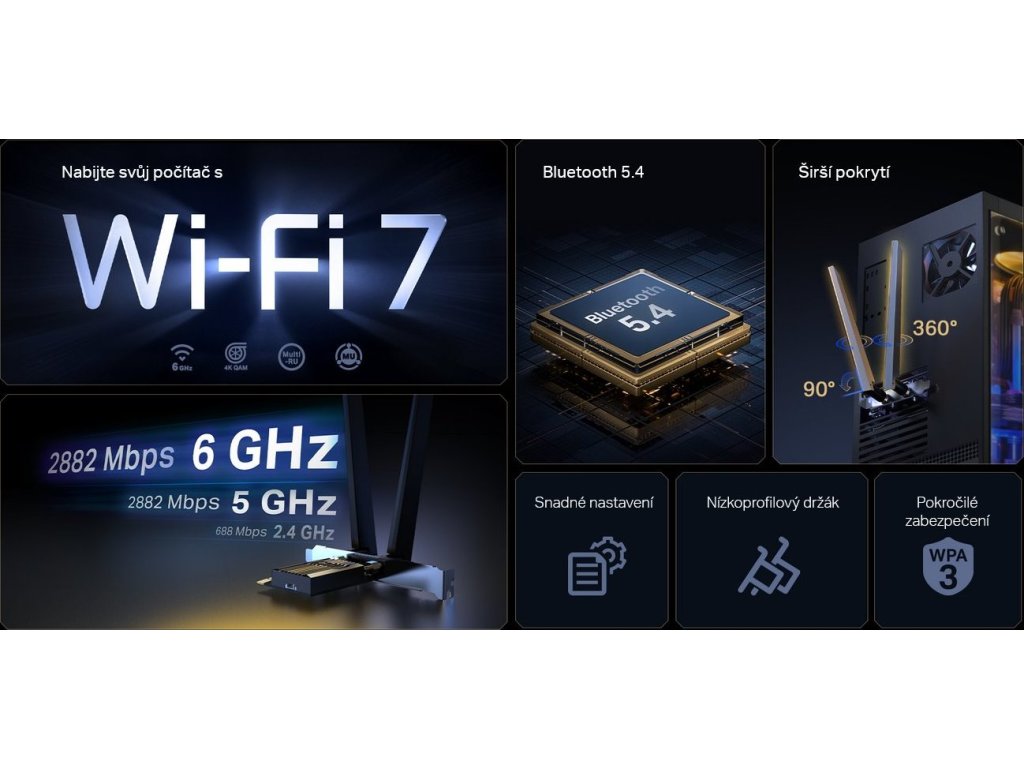Kompaktní síťová karta do PCIe rozhraní, která je nejen vybavena nejnovějším standardem Wi-Fi 7 ve všech třech pásmech (2.4 + 5 + 6 GHz), spolehlivým Bluetooth 5.4. Poskytuje extrémní přenosovou bezdrátovou rychlost (2882 Mbps pro pásma 5 a 6 GHz a 688 Mbps pro pásmo 2.4 GHz), ultra nízkou latenci, WPA3 šifrování, OFDMA, MU-MIMO a dvě odnímatelné antény s vysokým ziskem pro širsí pokrytí. Díky těmto vlastnostem si můžete užívat rychlejší stahování, plynulejší streamování a všepohlcující hraní.