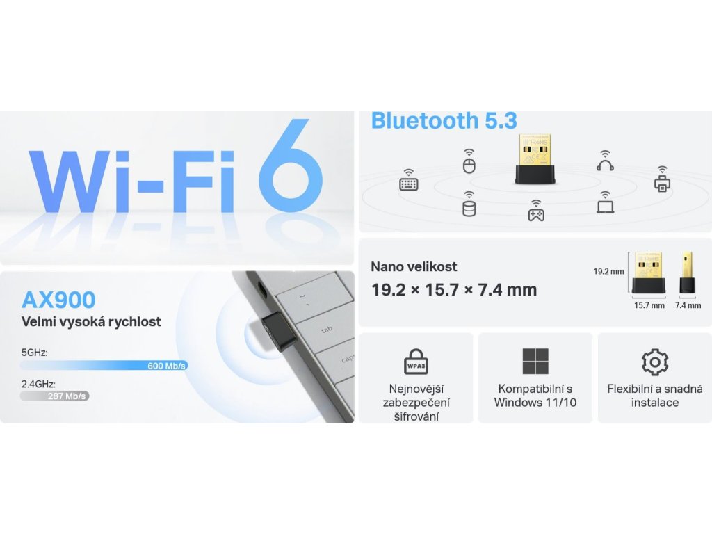 Bezdrátový mini USB adaptér poskytující vašemu počítači přístup k Wi-Fi (802.11a/b/g/n/ac/ax) a Bluetooth 5.3, využití pásma a také podporu dvou bezdrátových pásem - až 287 Mbps v pásmu 2,4 GHz a 600 Mbps v pásmu 5 GHz včetně nejnovějšího šifrování WPA3. Dvoupásmové připojení umožňuje výkonné pokrytí na 2.4 GHz s dlouhým dosahem a 5 GHz pro hraní her a streamování. Výhodou USB adaptéru je jeho malá velikost - nenápadný design vám umožní jej zapojit a zapomenout, že tam vůbec je.