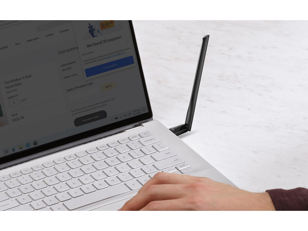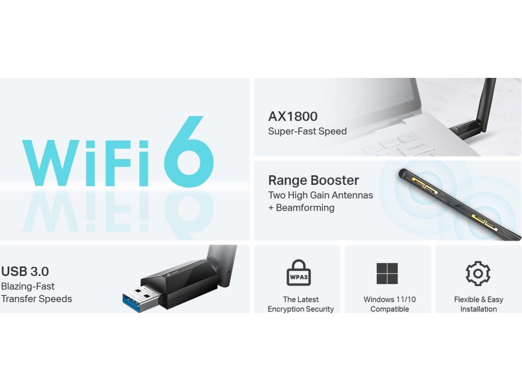 Wi-Fi 6 technologie přináší výrazně vyšší rychlosti až 576 + 1201 Mbps a nižší latenci, ideální pro streamování, hraní her i práci. Dvoupásmové připojení na 5 GHz a 2.4 GHz zajišťuje flexibilitu a stabilní signál i v rušnějším prostředí. Díky dvěma vysoce ziskovým anténám zabudovaným v jedné a s technologií Beamforming je zajištěn silný a stabilní příjem i na větší vzdálenosti. USB 3.0 rozhraní umožňuje až 10× rychlejší přenos než USB 2.0. O bezpečnost se stará šifrování WPA3.