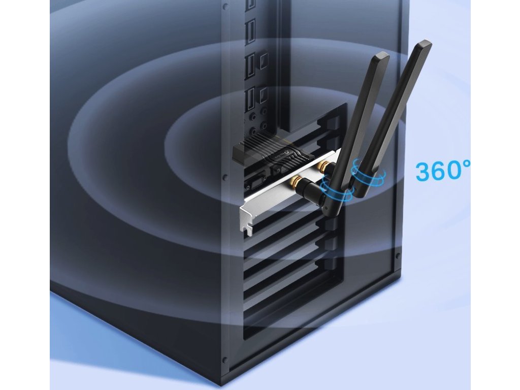 Kompaktní síťová karta vhodná do PCIe rozhraní, která je vybavena nejnovějším standardem Wi-Fi 6. Poskytuje extrémní přenosovou bezdrátovou rychlost, ultra nízkou latenci a nepřerušované připojení. Díky těmto vlastnostem si můžete užívat rychlejší stahování, plynulejší streamování a všepohlcující hraní.