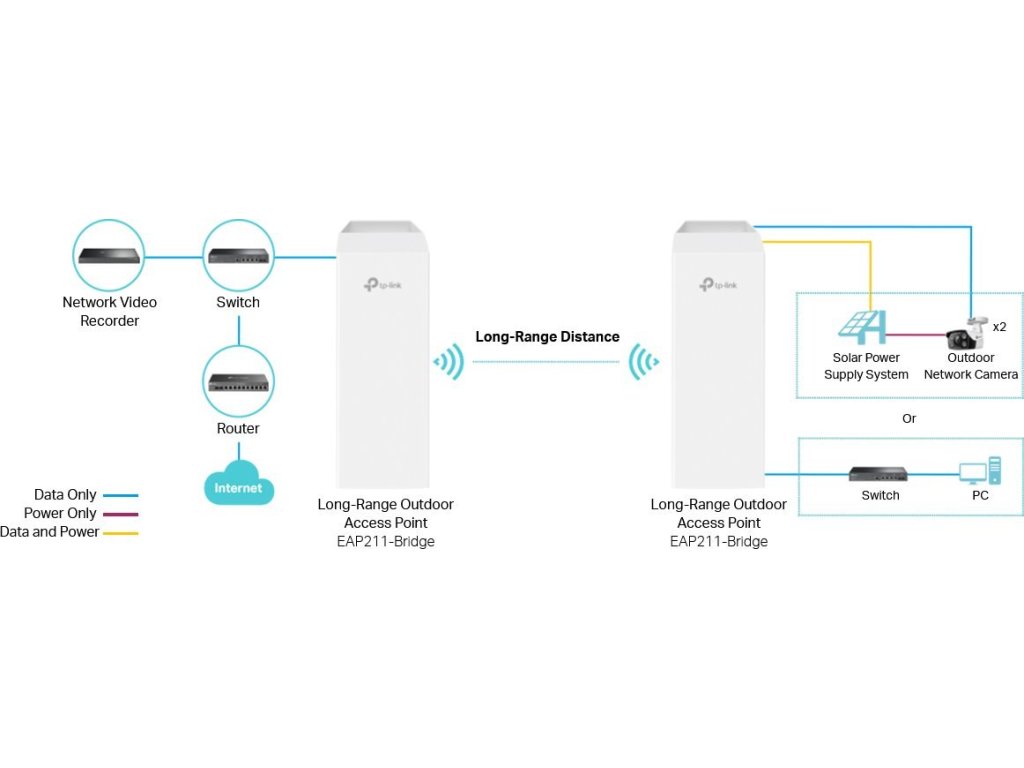 Bezdrátový Bridge KIT slouží ke spojení dvou budov či míst na vzdálenost až 1 km v rámci centrální správy Omada SDN. Jednotky pracují v bezdrátovém spektru 5 GHz s 802.11ac protokolem, modulační rychlostí až 866 Mbps a vyznačují se venkovním provedením s IP65 krytím, montáží na stožár, automatickým párováním a jednoduchým zaměřením díky LED na boku zařízení. Pro připojení do sítě slouží 3 Gigabitové LAN porty z čehož jeden umožňuje pasivní 24V PoE. Další možností napájení je přes 12V DC jack v případě vnitřních instalací.