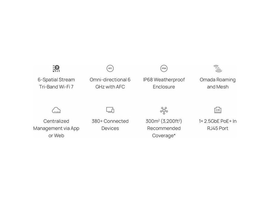 Výkonný přístupový bod přináší revoluci do venkovních sítí díky Tri-Band Six-Stream Wi-Fi 7, která poskytuje až 688 Mb/s (2.4GHz), 2882 Mb/s (5GHz), 5765 Mb/s (6GHz). Díky 6 GHz pásmu odemčenému pomocí AFC je možné využití nejmodernějšího spektra i venku, což zajišťuje vysokou rychlost a spolehlivé připojení pro různé komerční i rezidenční prostory.