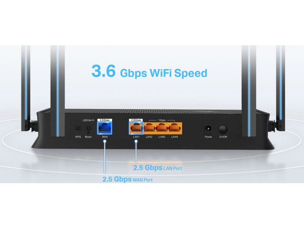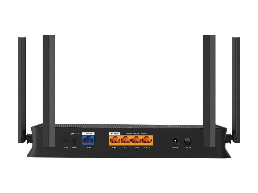 Router je vybaven 2,5GE WAN portem, 2,5GE LAN portem a třemi gigabitovými LAN porty, které zajistí ultrarychlé a spolehlivé připojení k internetu i v náročných podmínkách. Tato flexibilní kombinace umožňuje snadno rozšířit síť pro chytrou domácnost, firemní pracovní stanice i herní sestavy. Stabilita a rychlost přenosu dat tak posouvají vaši síť na profesionální úroveň.