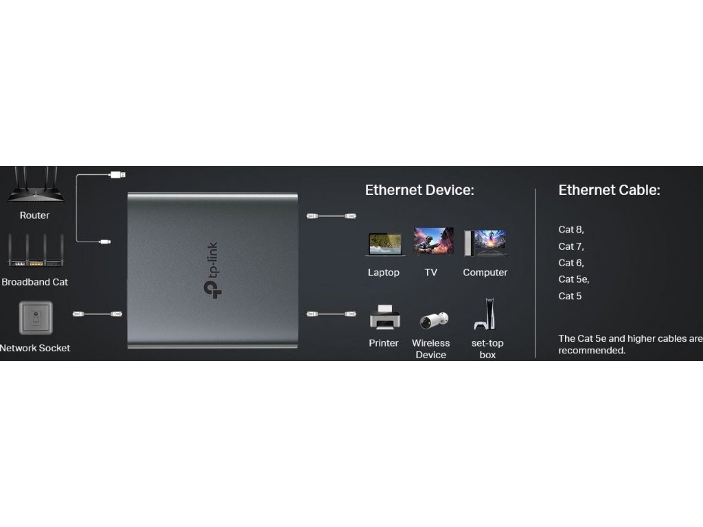 - Kompatibilita s kabely Cat 8/7/6/5e/5 a širokou škálou zařízení