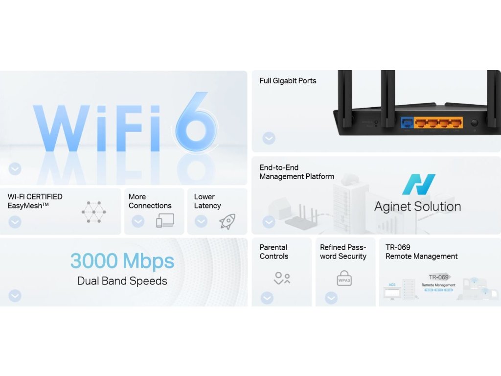 Moderní Wi-Fi 6 Dual-Band router značky TP-Link obsahující 4× 10/100/1000 Mbps LAN, 1× 10/100/1000 Mbps WAN a 4 fixní antény. Bezdrátová část umí pracovat ve dvou pásmech zároveň a to rychlostí 574 Mbps ve 2.4GHz pásmu a 2402 Mbps v pásmu 5 GHz. Router podporuje IPv4 ale i IPv6 routováním a i vybranými VPN servery (PPTP, OpenVPN, L2TP a IPSec). Router kromě nejpoužívanějšího modu AP Router podporuje i režim Access point.