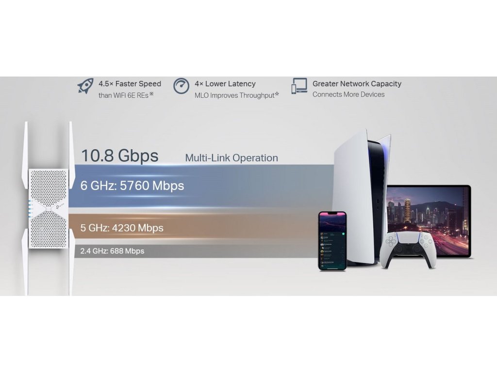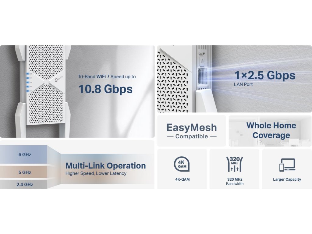 Rozšiř své domácí Wi-Fi o ultra vysoké rychlosti díky podpoře nejnovějšího standardu Wi-Fi 7 a využij výhod tří pásem: 6 GHz (5764 Mbps), 5 GHz (4323 Mbps) a 2.4 GHz (688 Mbps). Technologie Multi-Link Operation (MLO) zajišťuje plynulé přepínání mezi pásmy pro stabilní a rychlé připojení. Díky 2.5G Multi-Gigabitovému portu si užiješ bleskové stahování i streamování bez zpoždění. Podpora EasyMesh umožňuje snadné rozšíření sítě a dokonalé pokrytí celého domu.