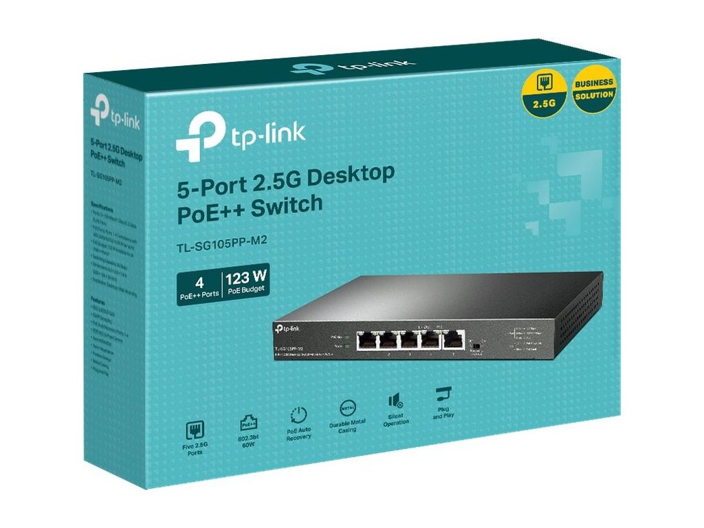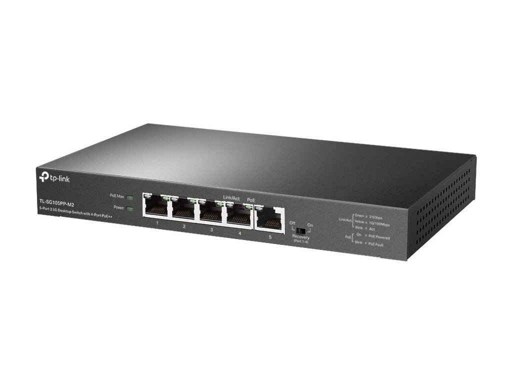 Multi-Gigabitový desktopový PoE switch bez managementu značky TP-Link v odolném kovovém šasi s (5) 2.5Gigabit LAN. První 4 porty podporují PoE out 802.3af/at/bt (60 W / port) a sloužící pro napájení kamer, access pointů a podobných zařízení s podporou aktivního PoE. Celkový PoE budget pro PoE porty je celkem 123 W. Switch má na své přední straně přepínač pro zapnutí PoE Auto Recovery funkce zajišťující automatické restartování napájení pro koncové prvky, jenž přestanou komunikovat.